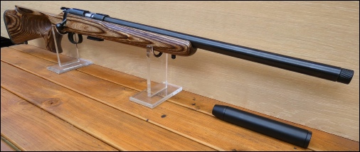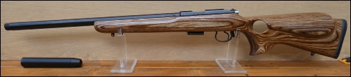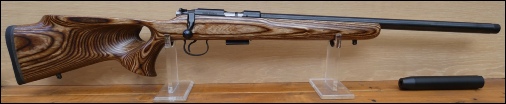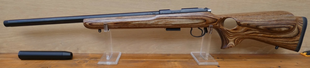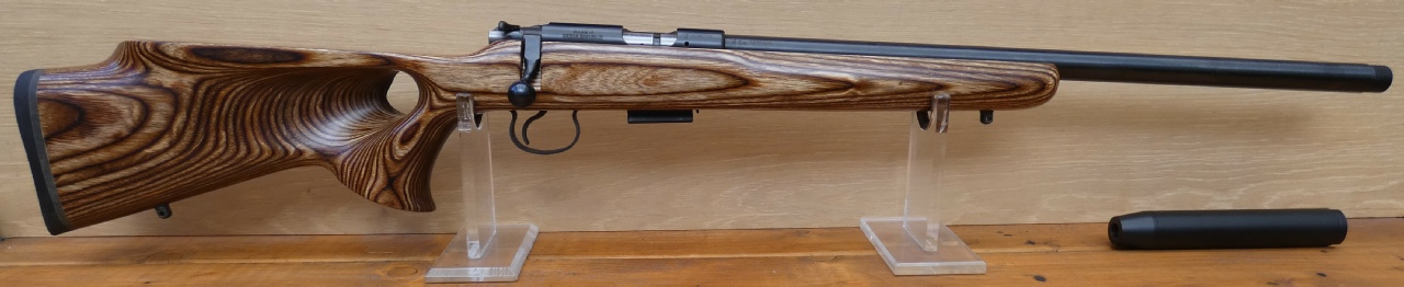 This is a lovely little .22WMR rifle in very good condition with a low round count. Bore is mint, with no loss of bluing to the external surfaces. The 21” heavy varmint barrel is fitted with a ½ x 20unf threaded muzzle, and the brown laminate thumbhole stock is pristine with a couple of very minor transit marks that are very difficult to spot .